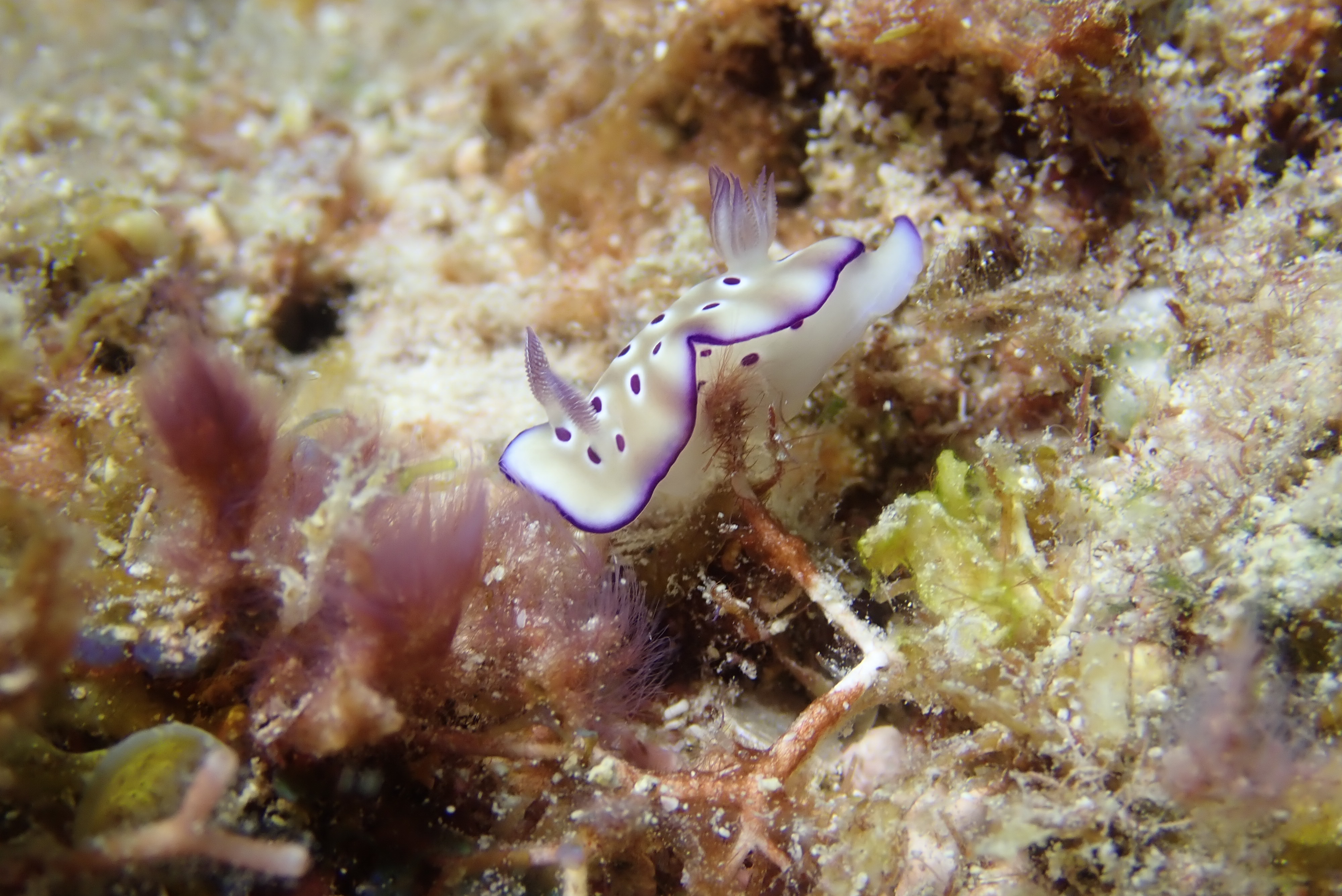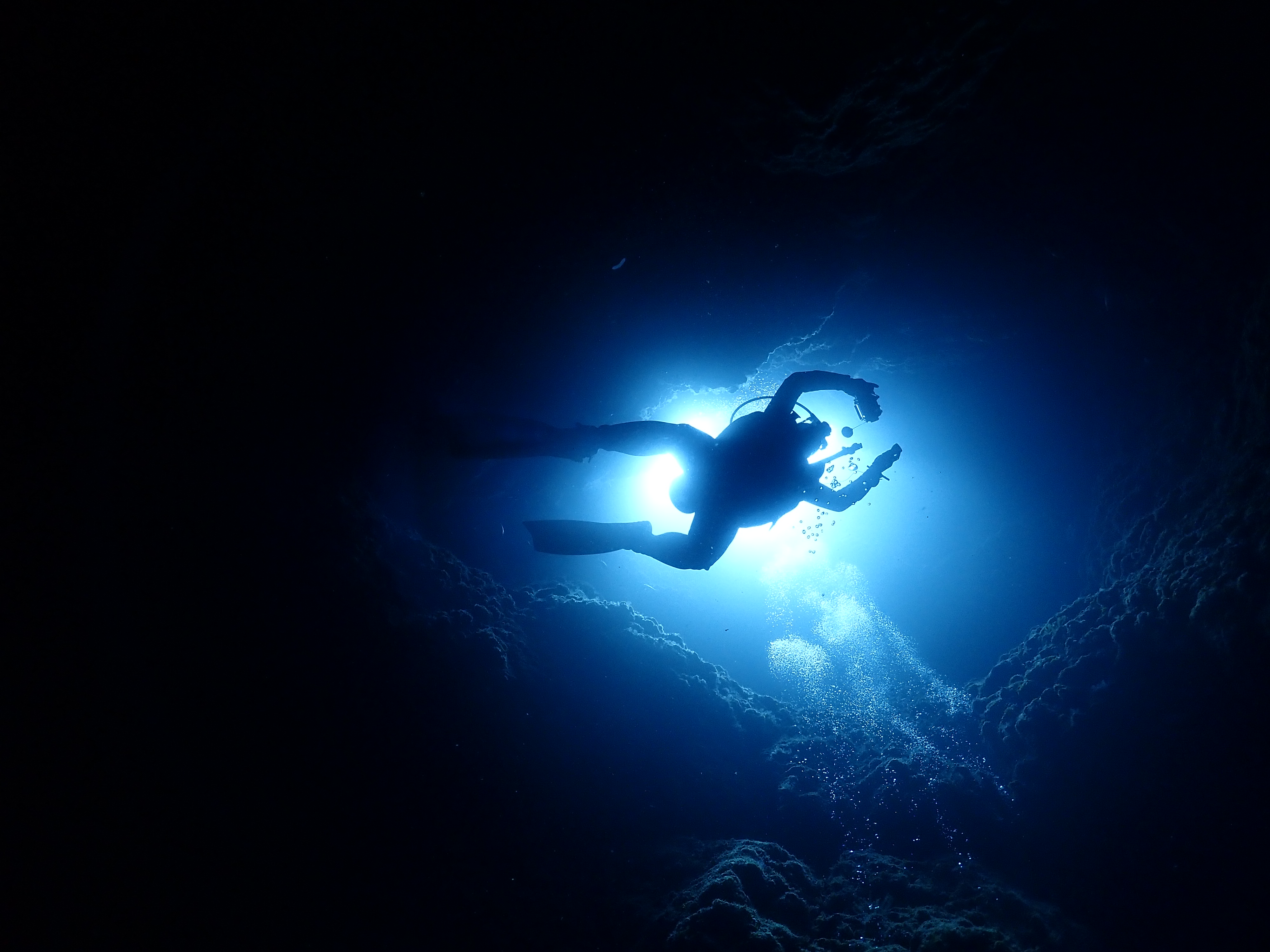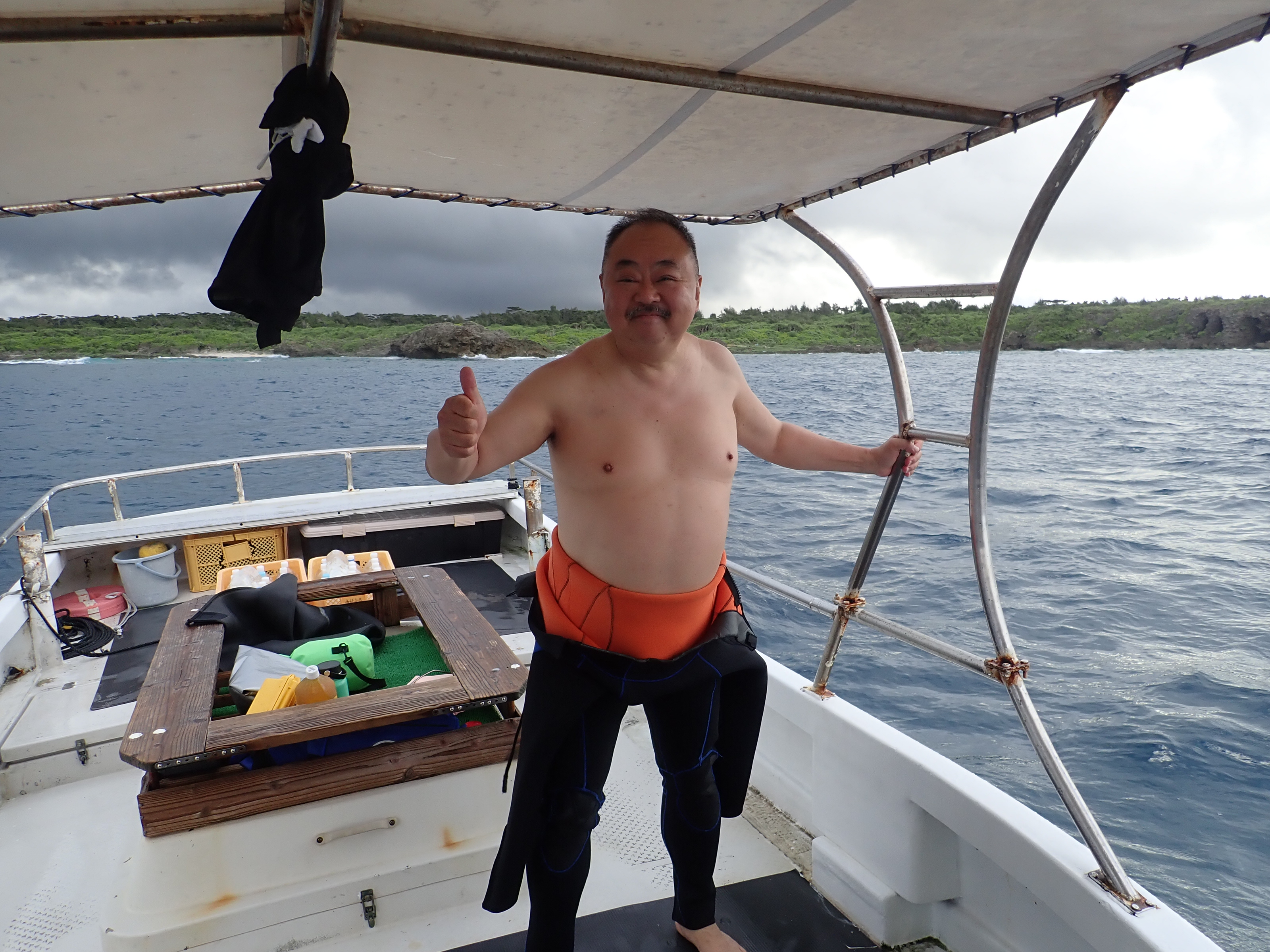 島に寄ると岩からの跳ねっ帰りでさらにドンブラコそれでも元気にダイビング