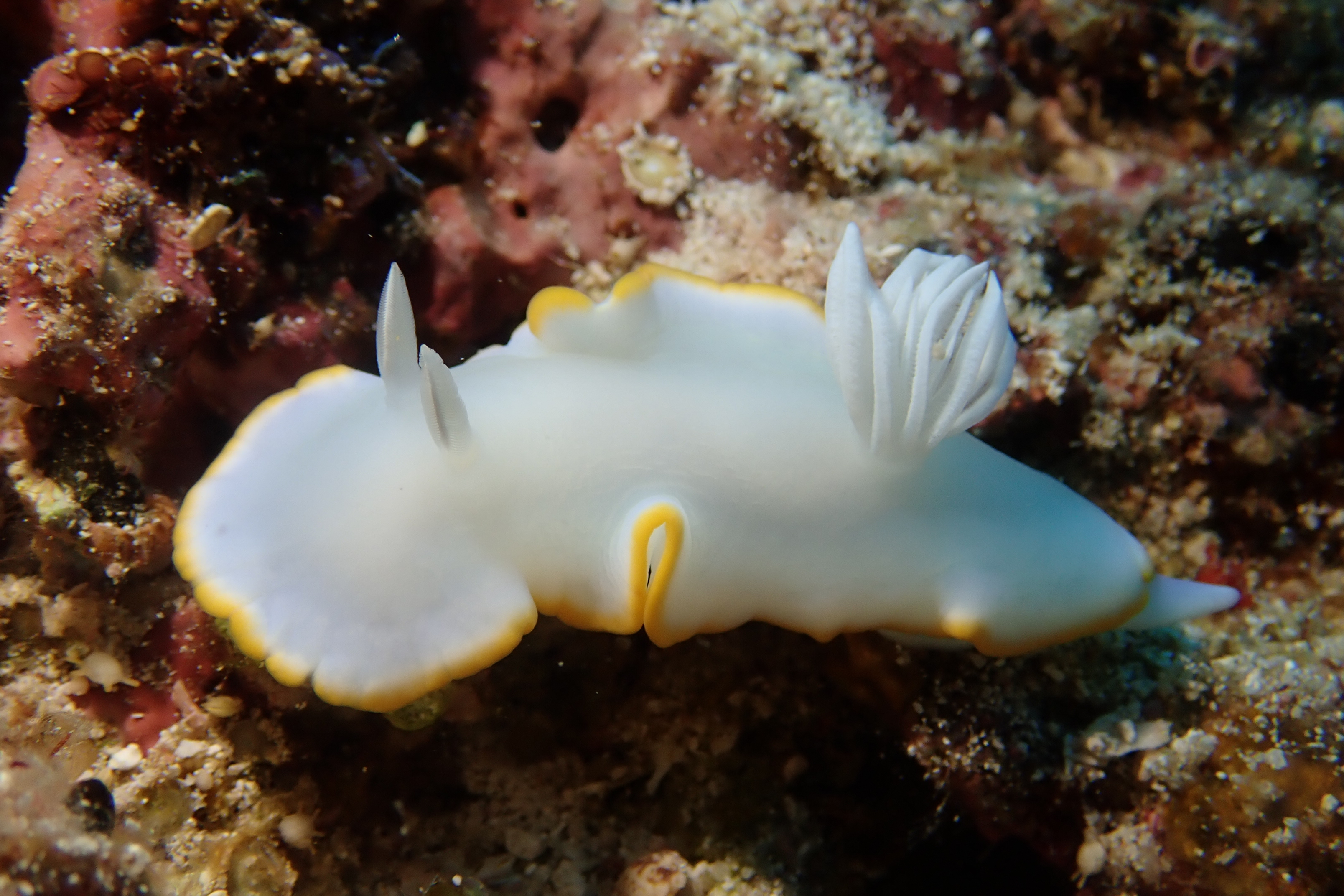 とても足の速いメレンゲウミウシ と じ~~~っとしているアカテンイロウミウシ