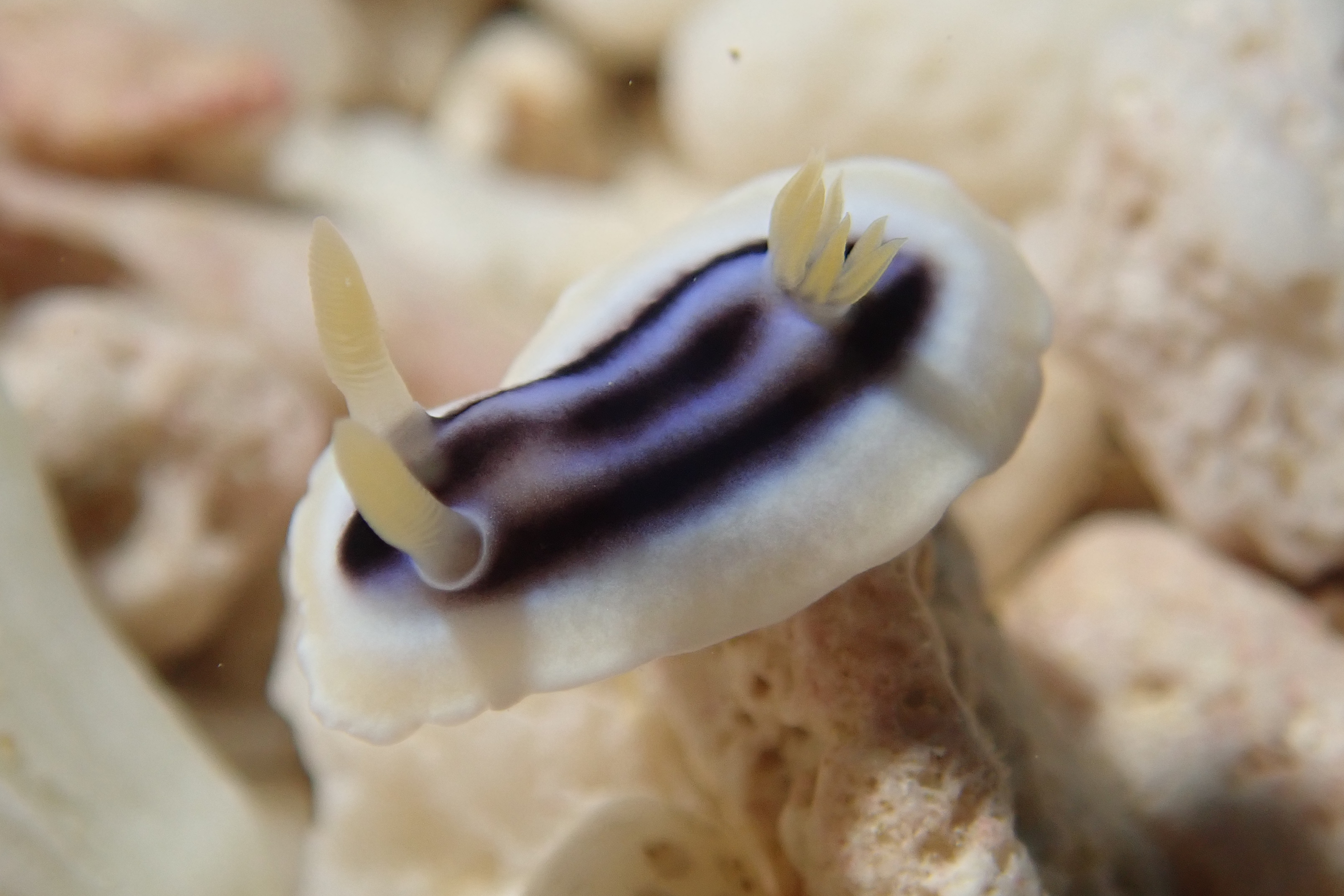 石の上に乗ってシーソをして遊んでいた シライトウミウシ とオシャレカクレエビ