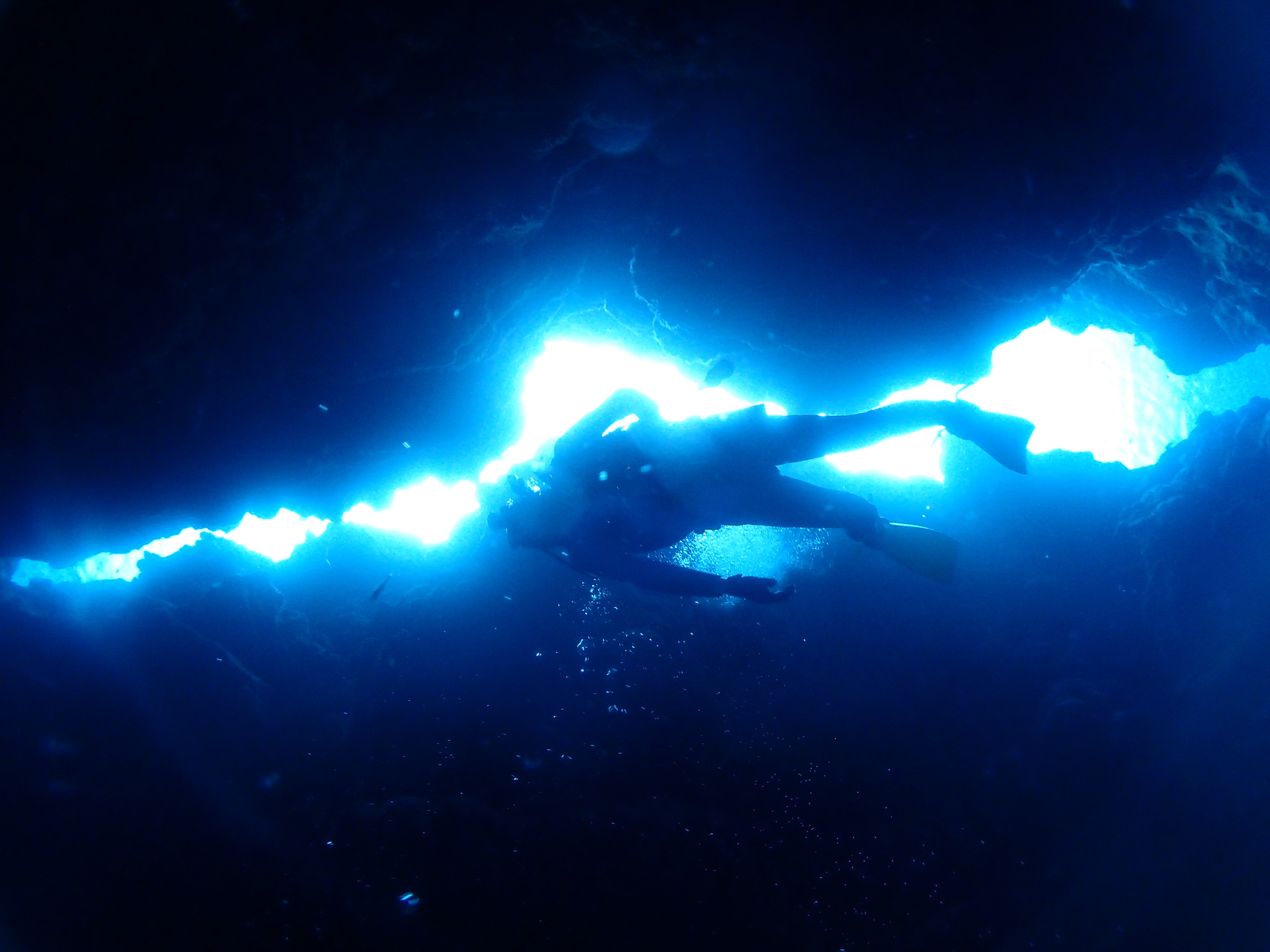 ダイバーが入った洞窟の天井から、プクプク泡がこぼれています![]()