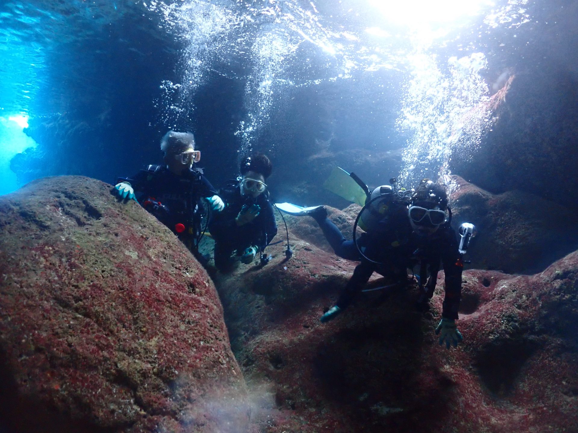 水底に広がる岩肌に紫色の卵がとても沢山(時期によって色等は変わります)