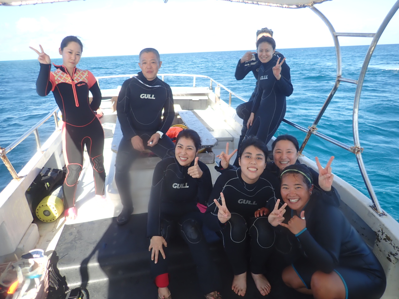 集合写真にはいらっしゃいませんが、午後からも体験ダイビングのお客様を乗せて