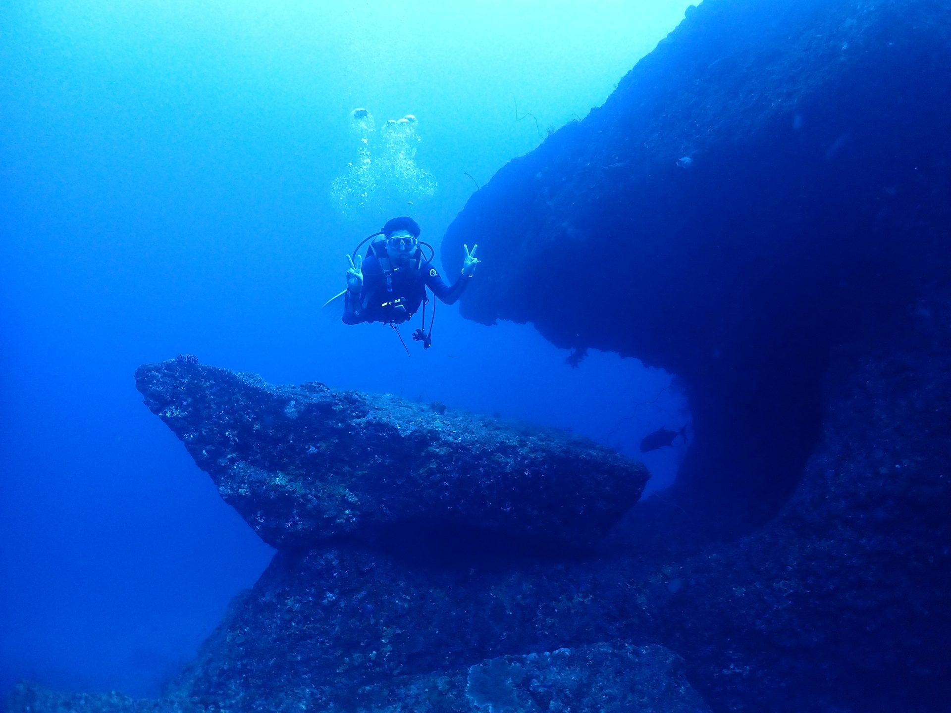 アーチ状の近くに1m位の大きさロウニンアジに遭遇しゲストさんはレンタルしていたカメラで