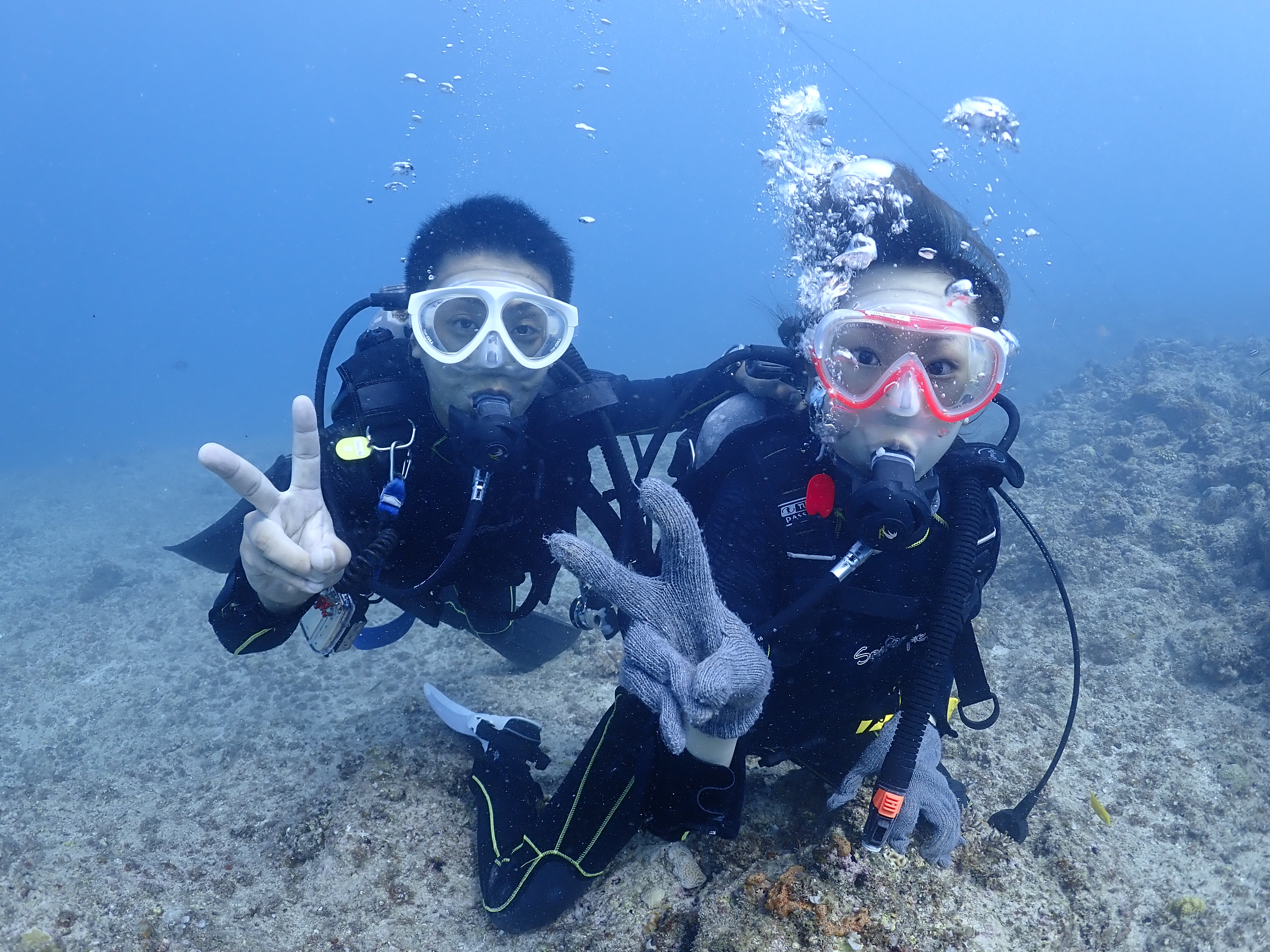 彼氏さんがライセンスダイバーで、彼女さんの初めての体験ダイビングを陰ながら支えています![]()