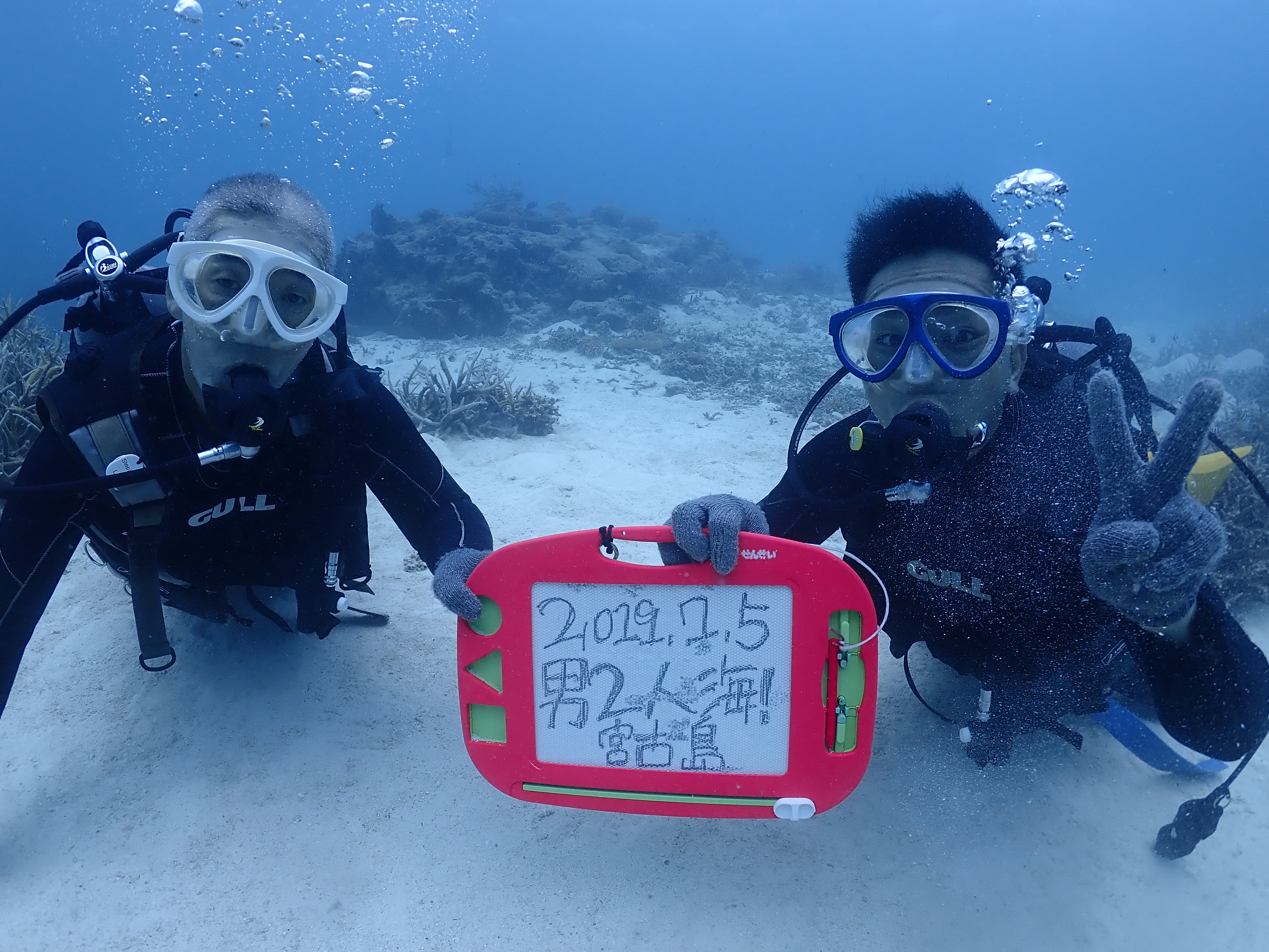 慰安旅行中のお二人、先輩と後輩だそうで、後輩は今回、初めてのダイビングに挑戦です![]()