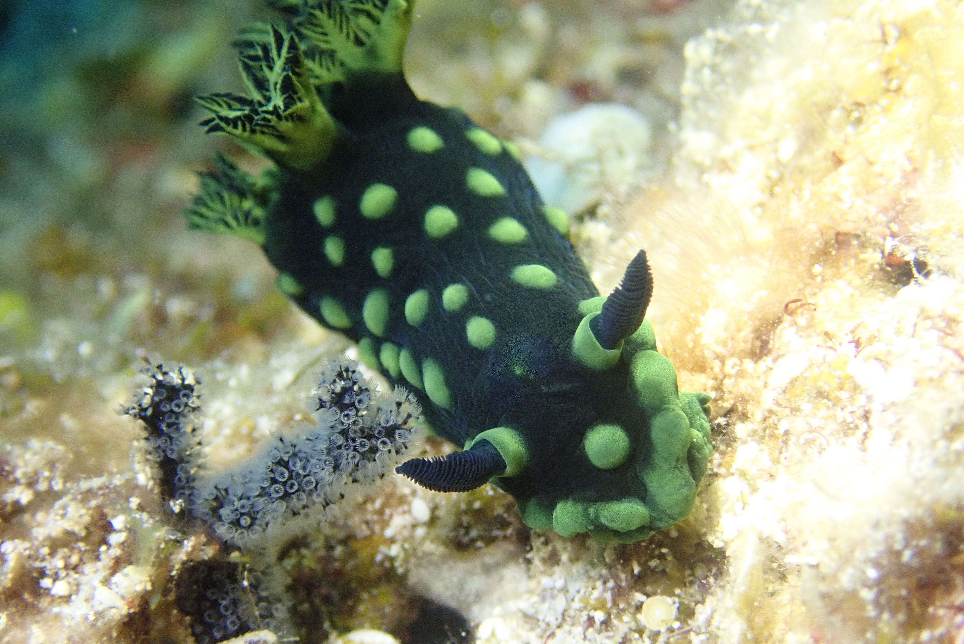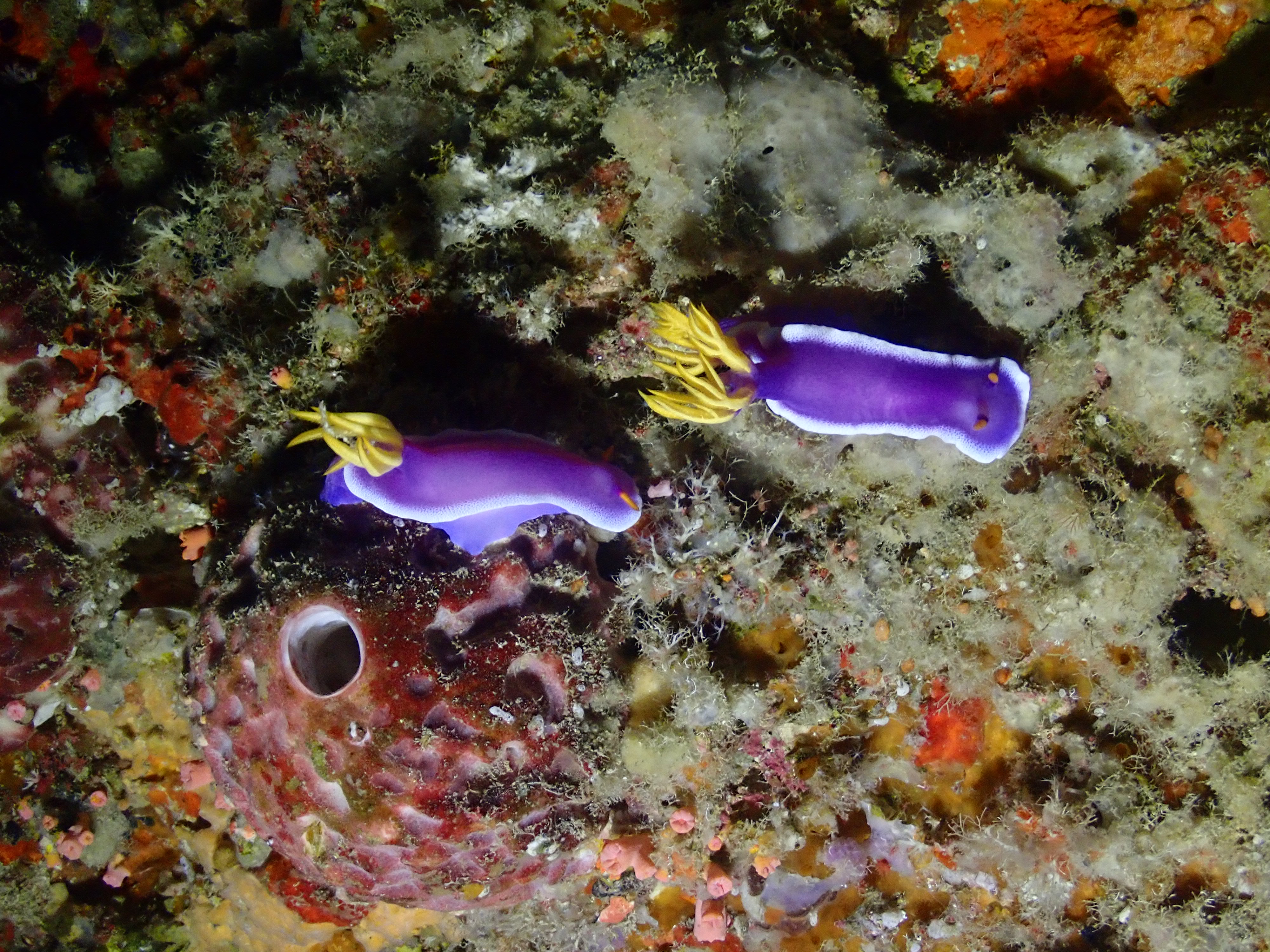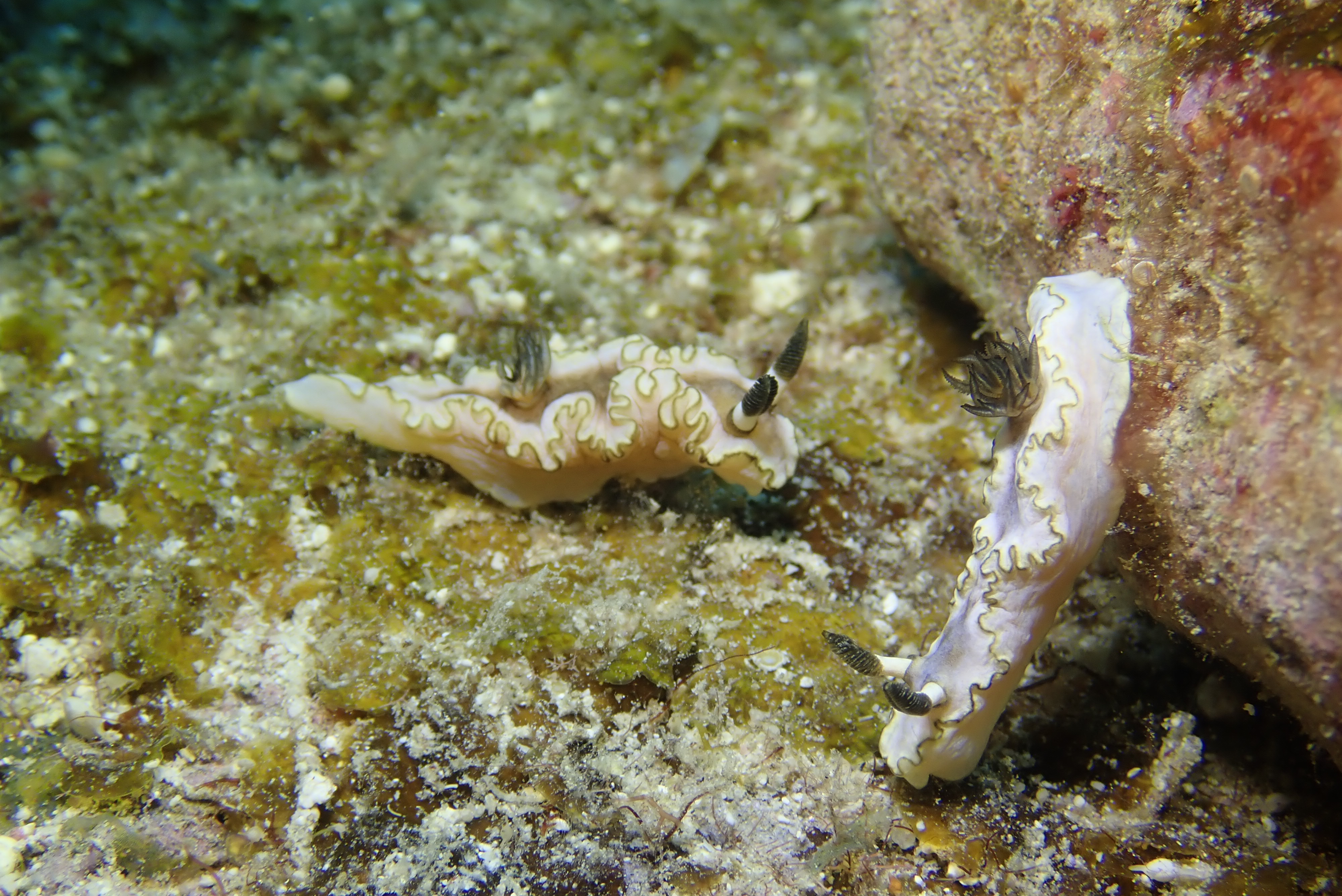 お散歩中のキイロウミウシ と 捕食中かな?トサカリュウグウウミウシ