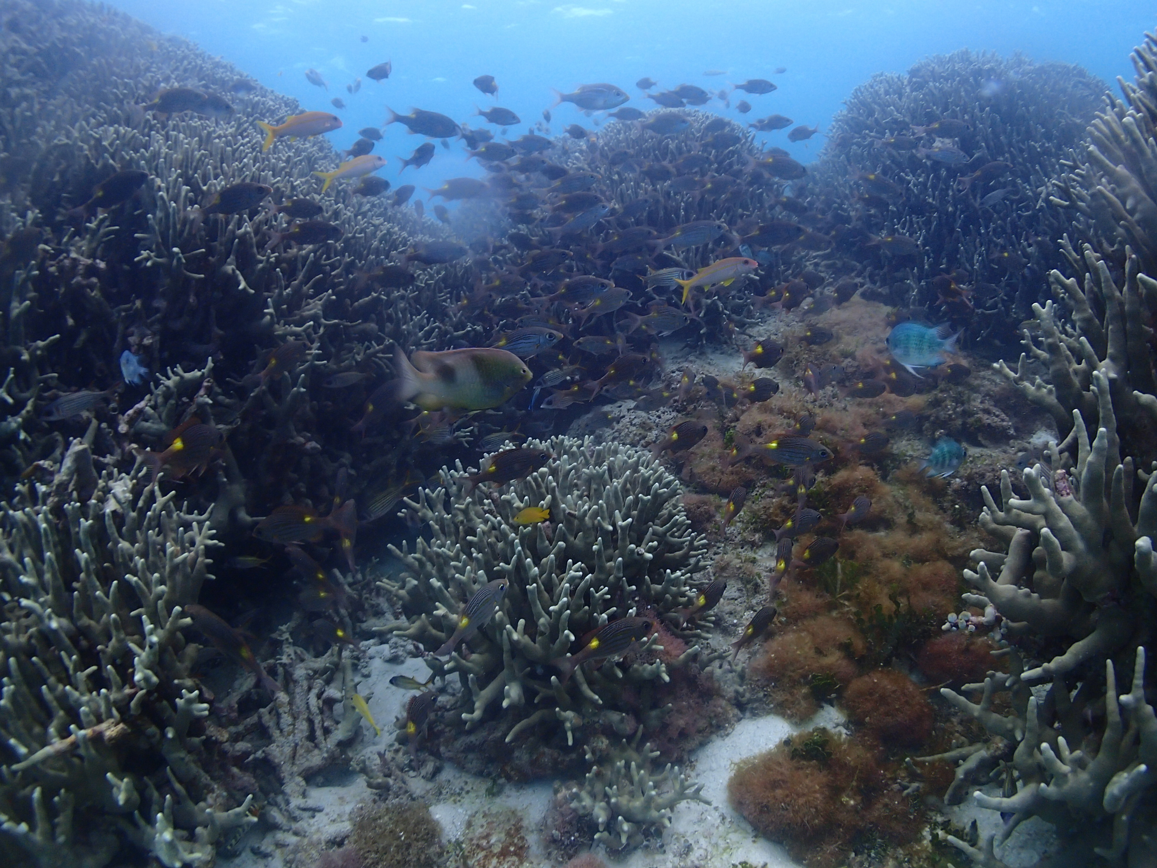 コーラルガーデンの大きなユビエダハマサンゴにはお魚がいっぱいです![]()