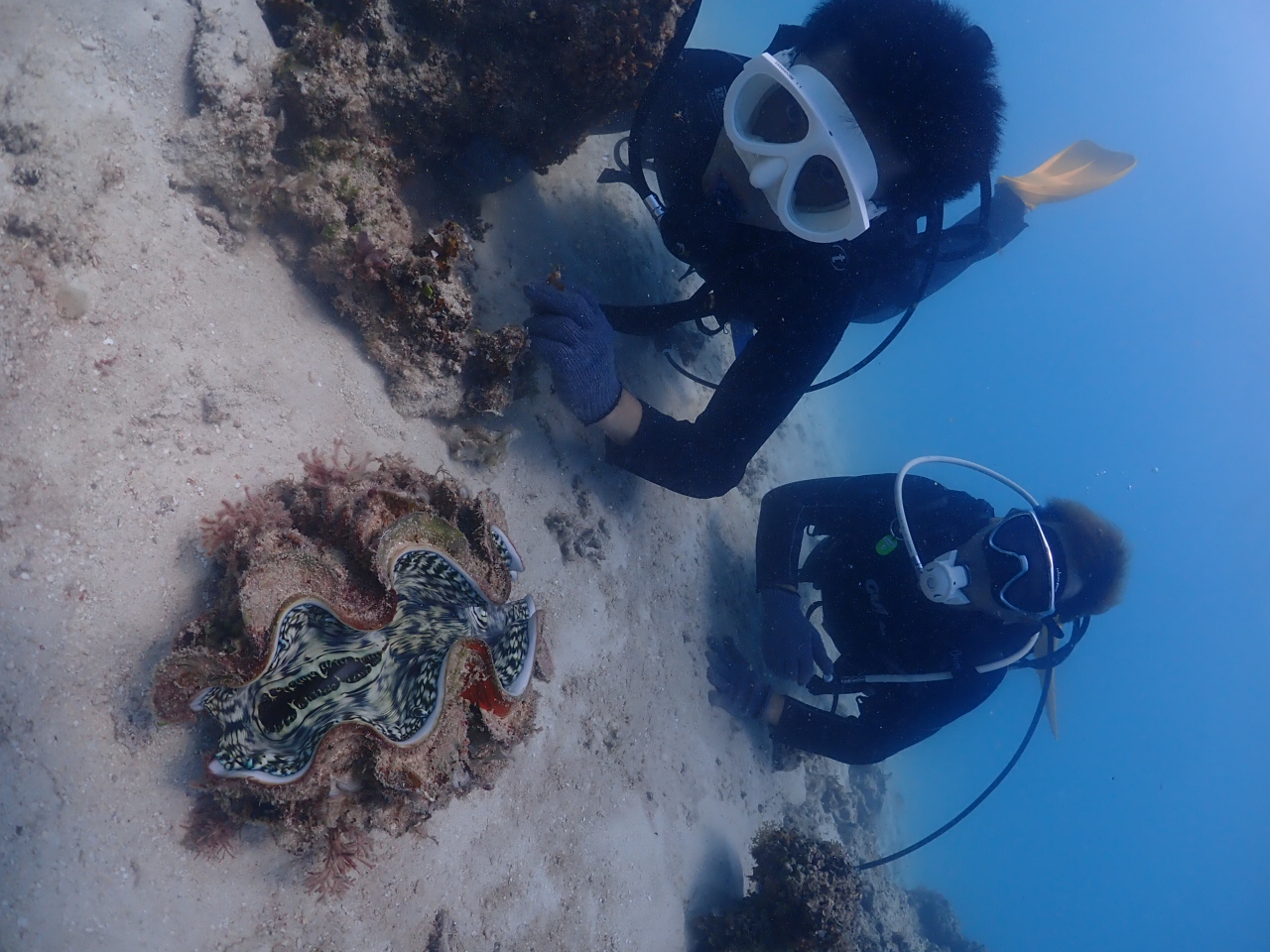 大きなシャコガイを目の前にツンツンと遊んでました![]()