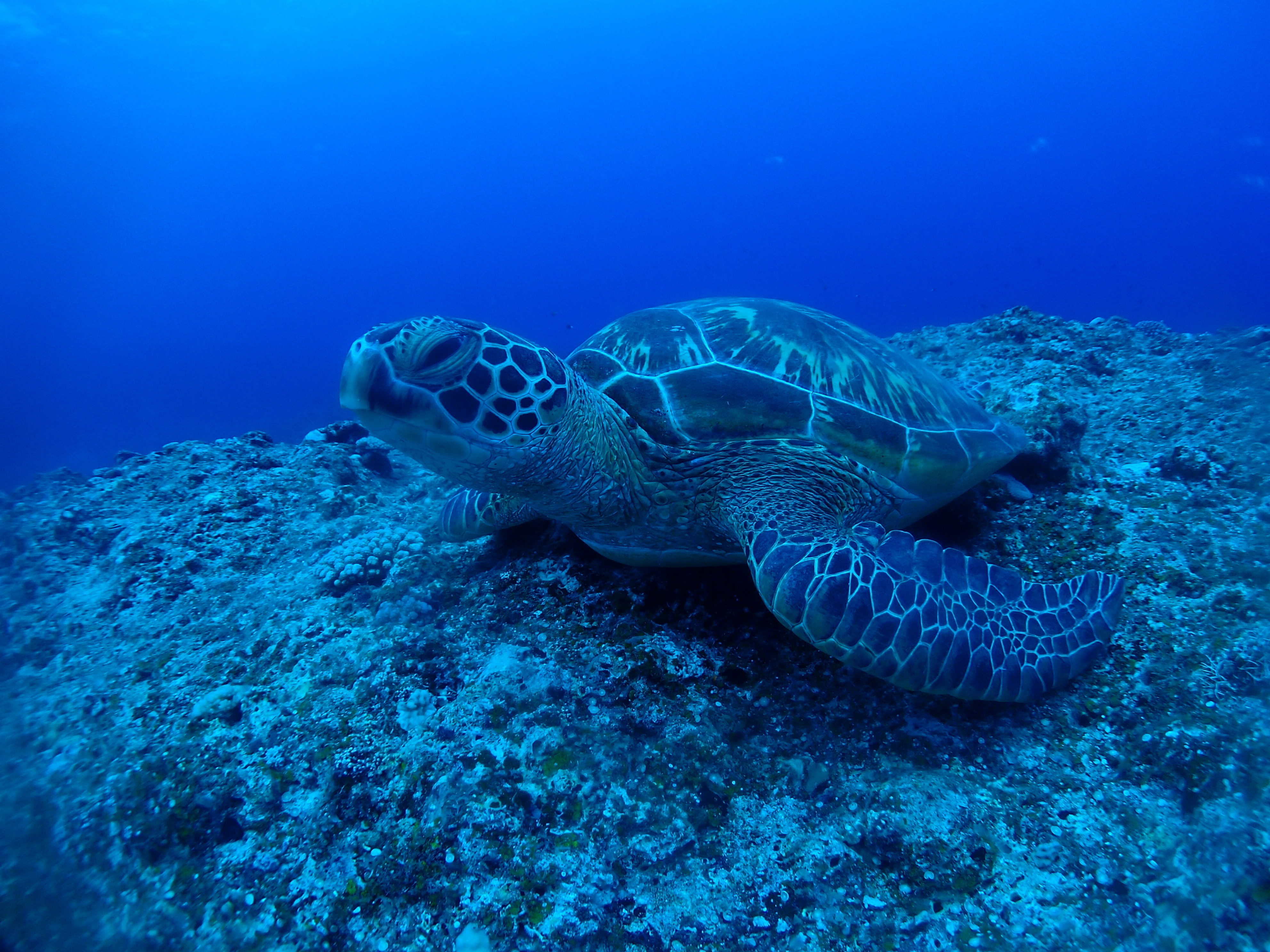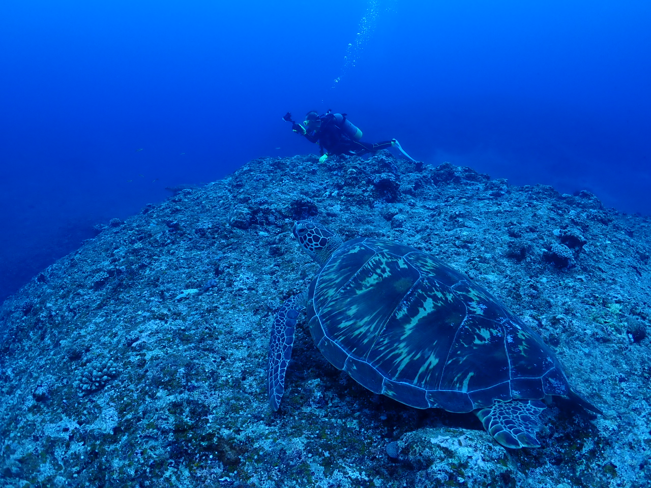 こちらは、もう1匹のウミガメさんを撮影しているところを、ウミガメさんに見られるの図![]()