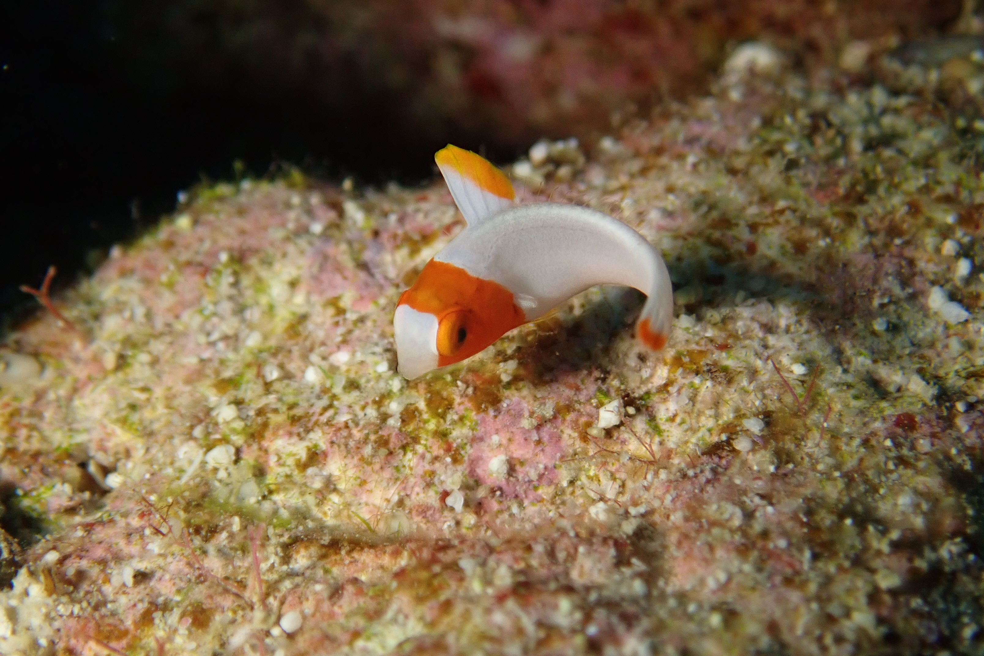 オジサン顔のホシゾラワラエビ と チョコンと座るイロブダイの幼魚
