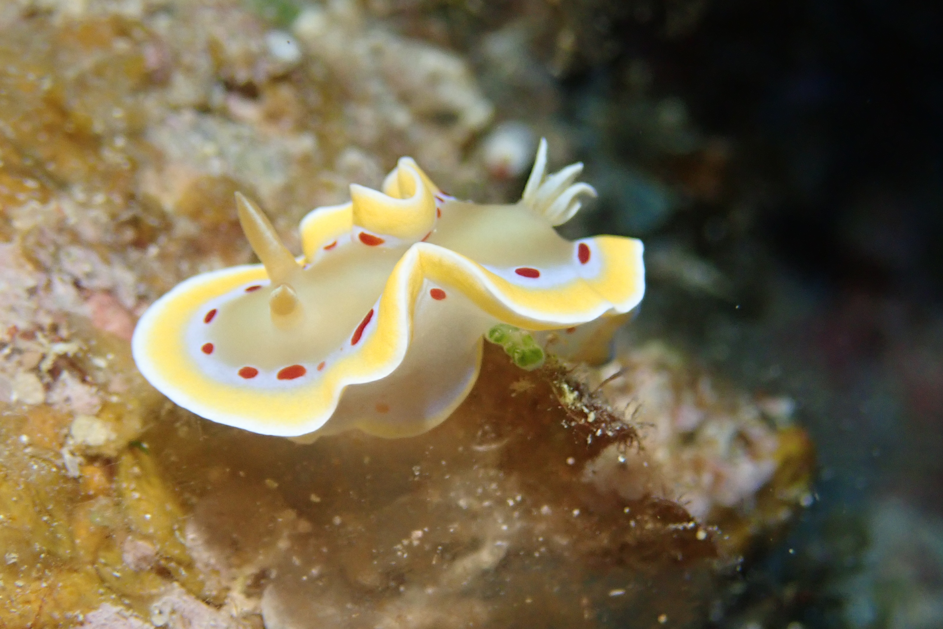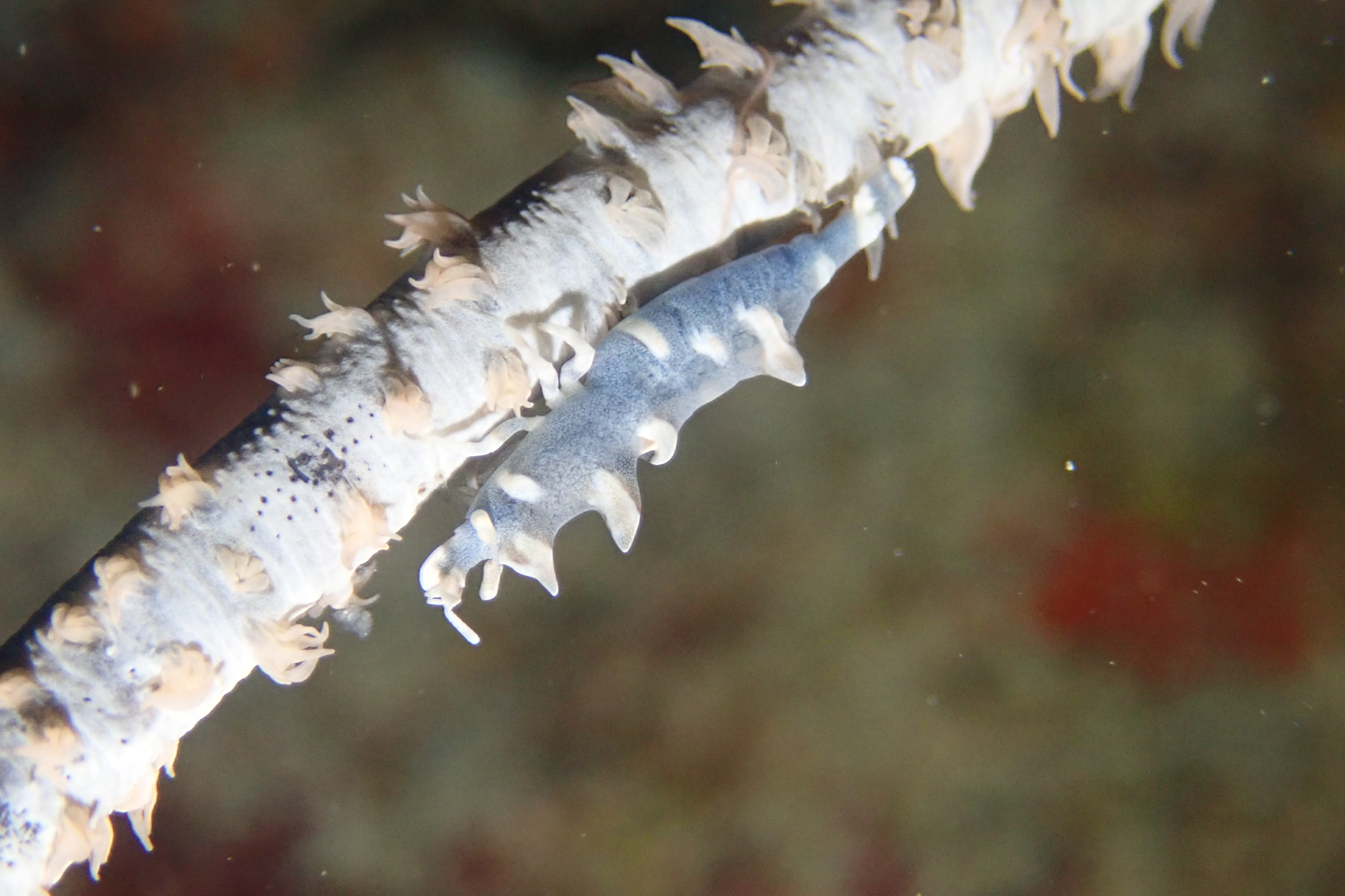 立ち上がろうとするミゾレウミウシ と フワフワヒレを動かすアカテンイロウミウシ