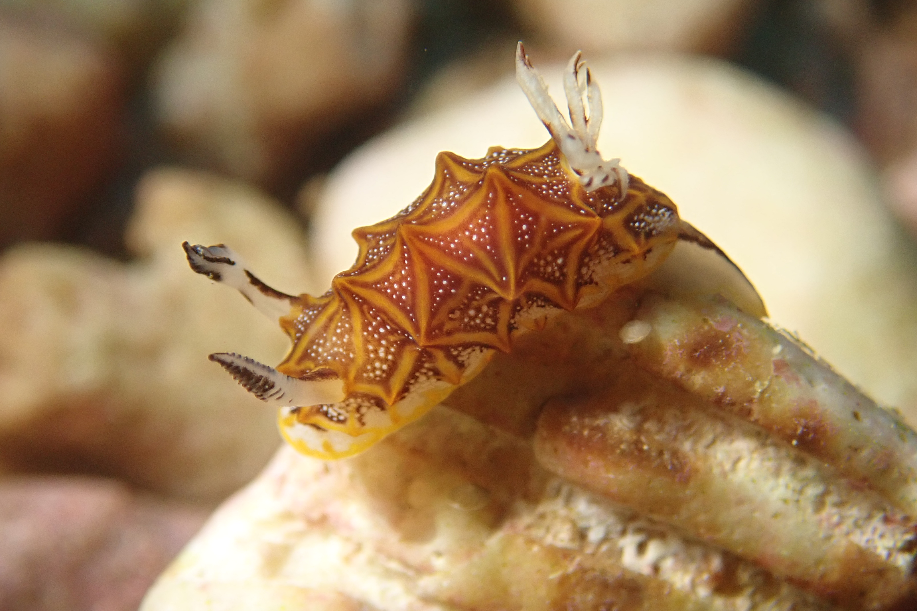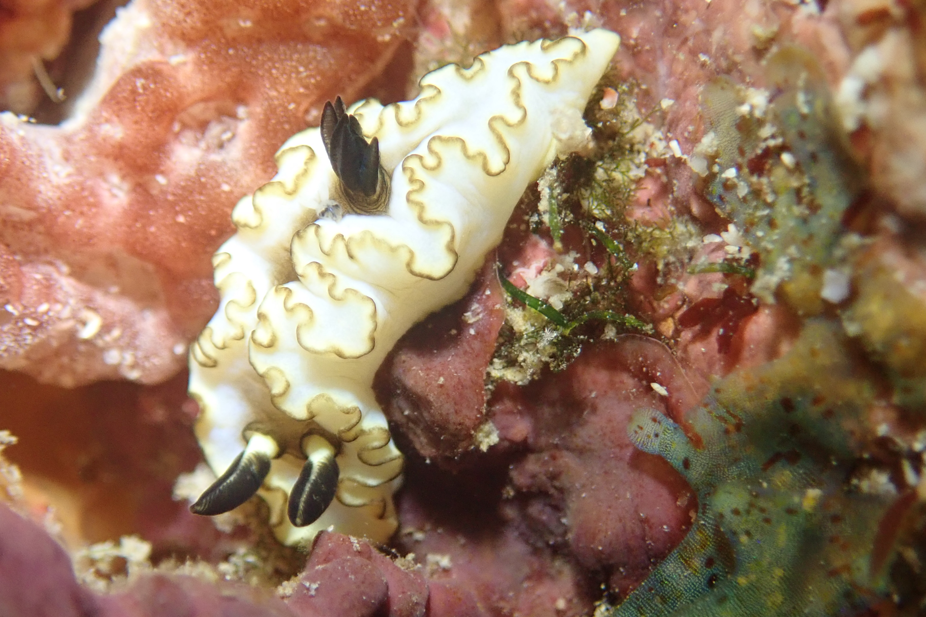 小さなモザイクウミウシ と かくれんぼ中?キイロウミウシ