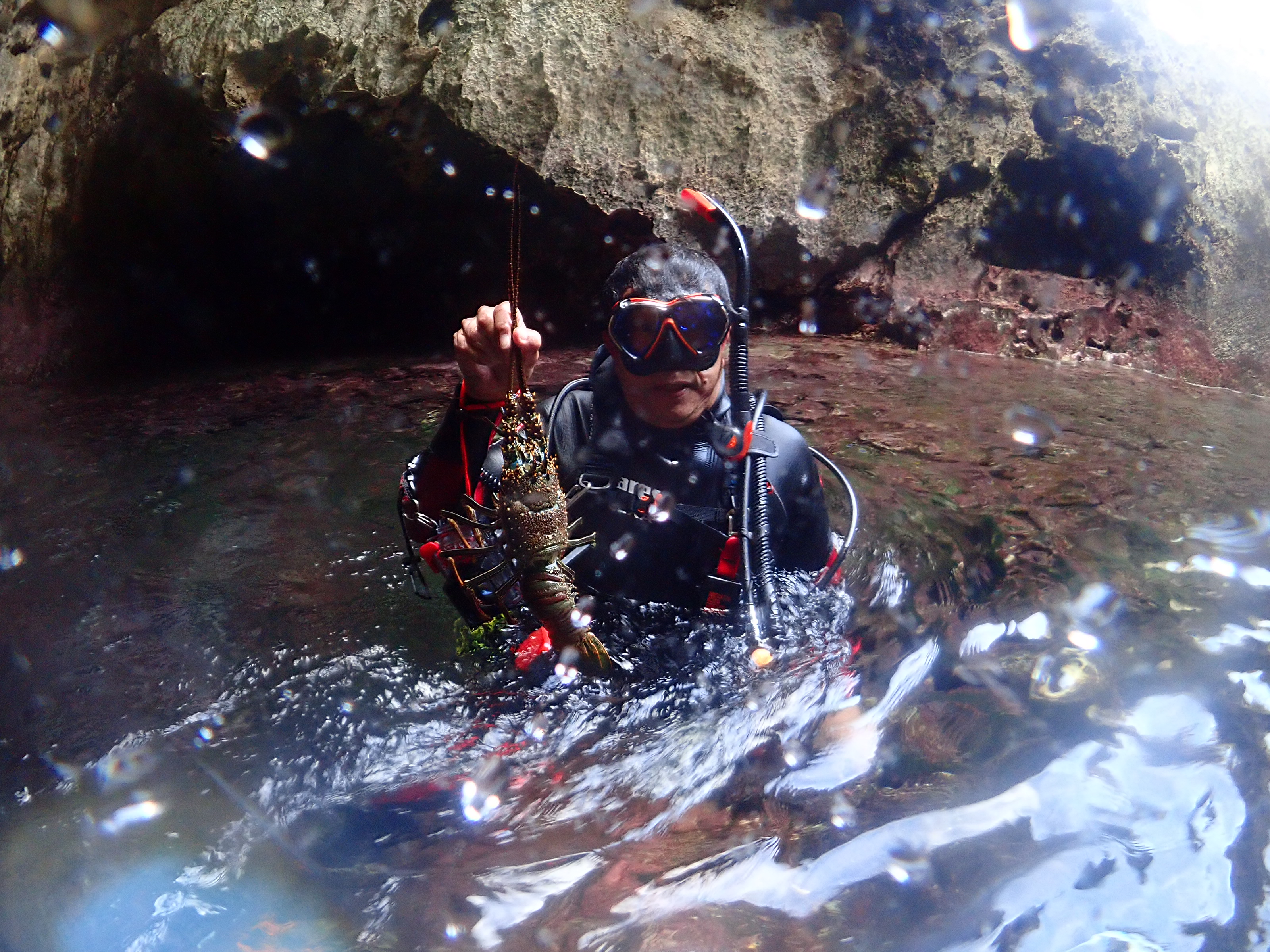 とご自慢の水中ライトで洞窟探検すると