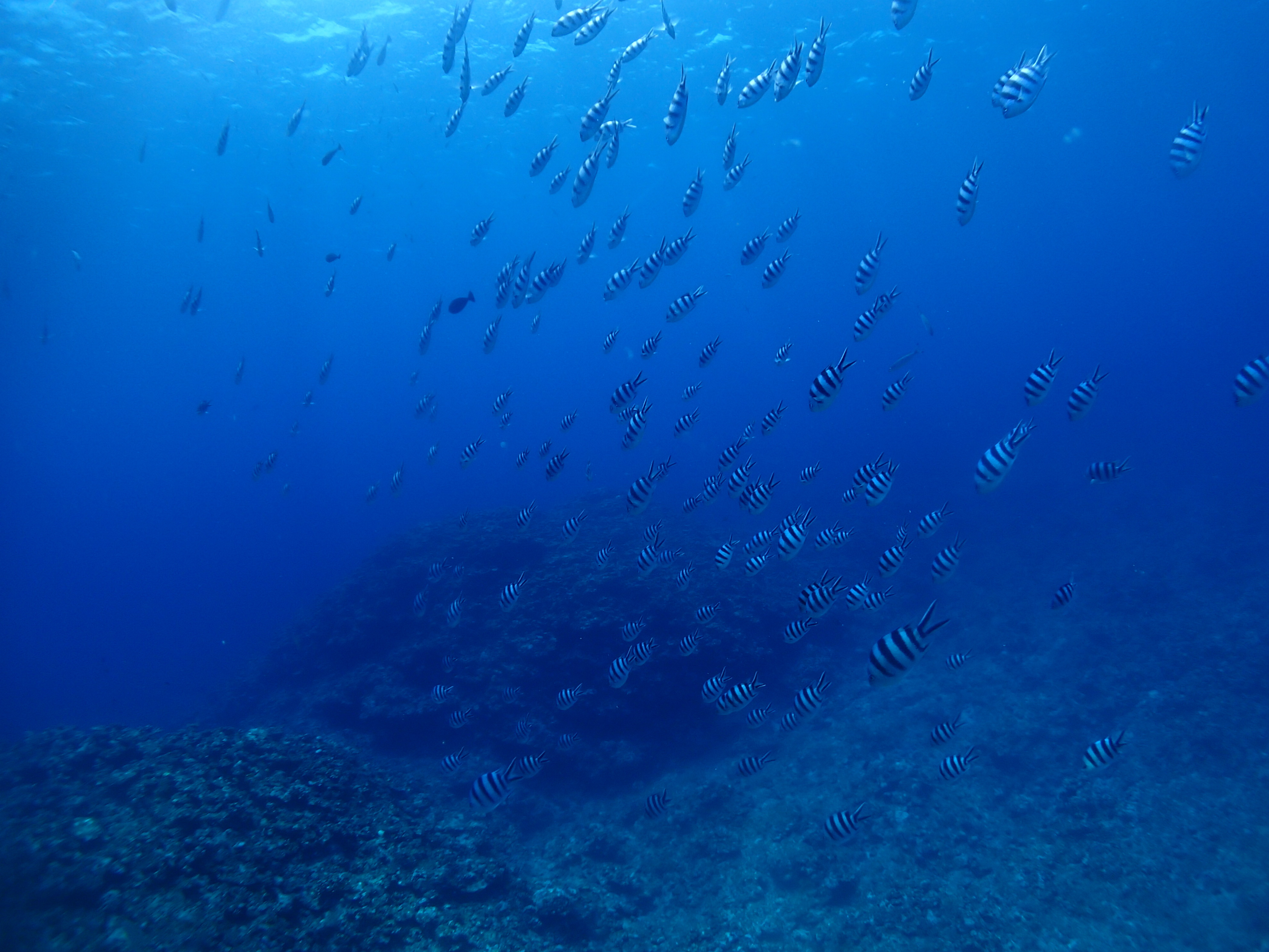 サバ沖のお魚の群れの中に、違うお魚が混ざっていたり![]()