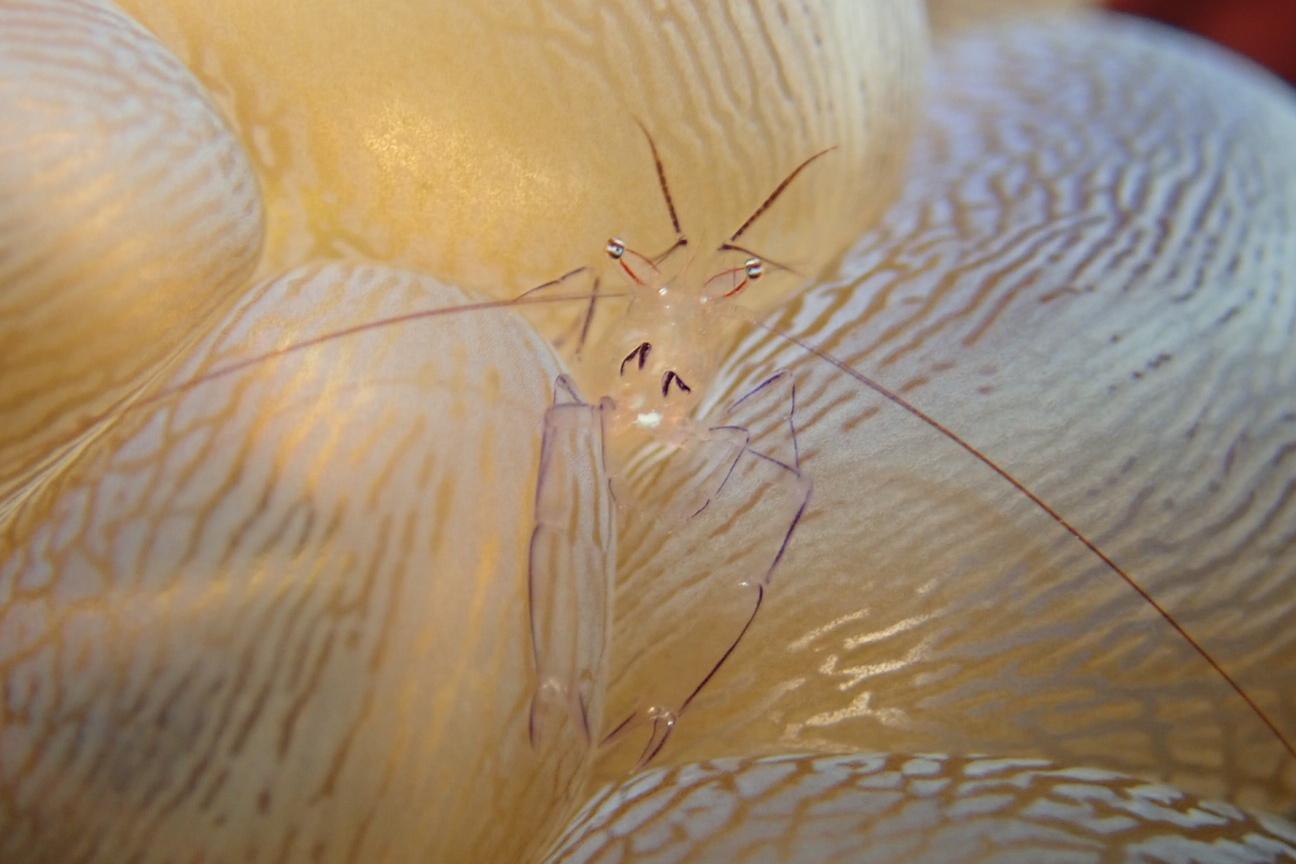 光を当てると発光するウコンハネガイ(発光してない・・・)とバブルコーラルシュリンプ