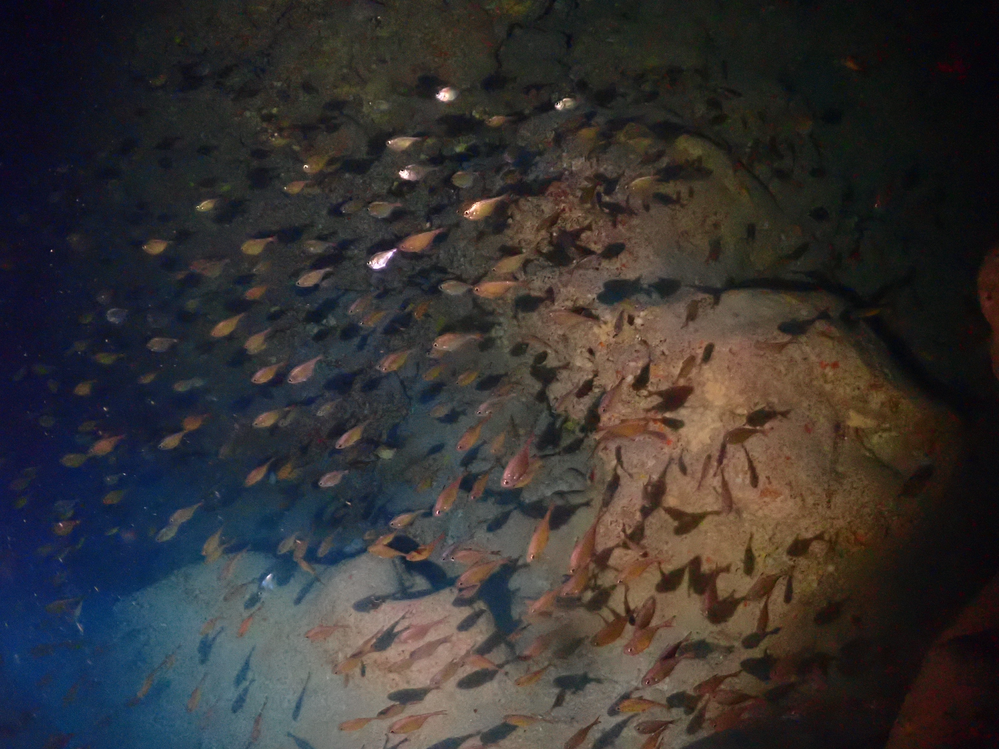 肉眼ではキラキラと光るの解る ハタンポの群れとウコンハネガイ