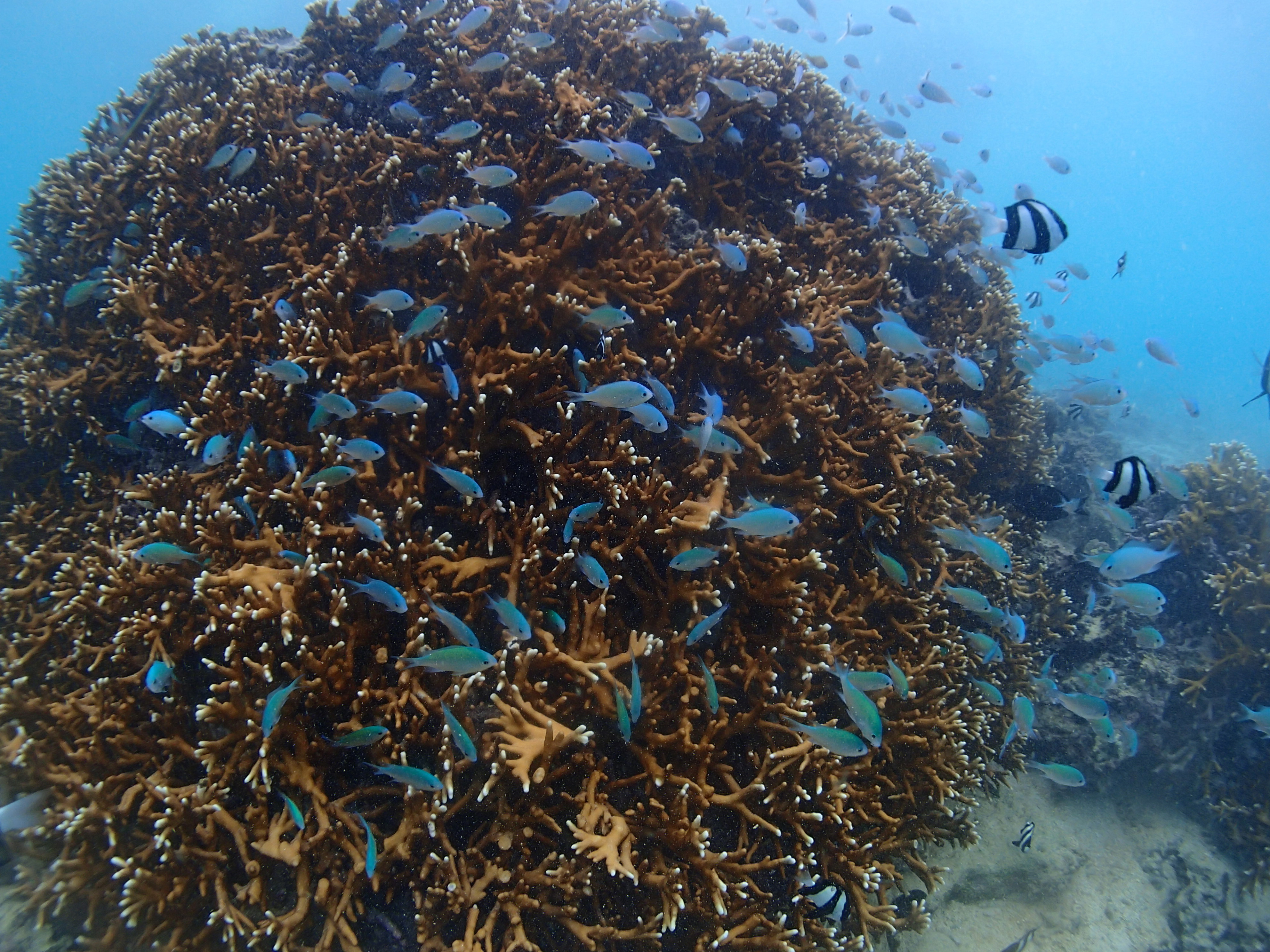 サンゴを群れで漂うデバスズメダイが海のデコレーションケーキみたい![]()