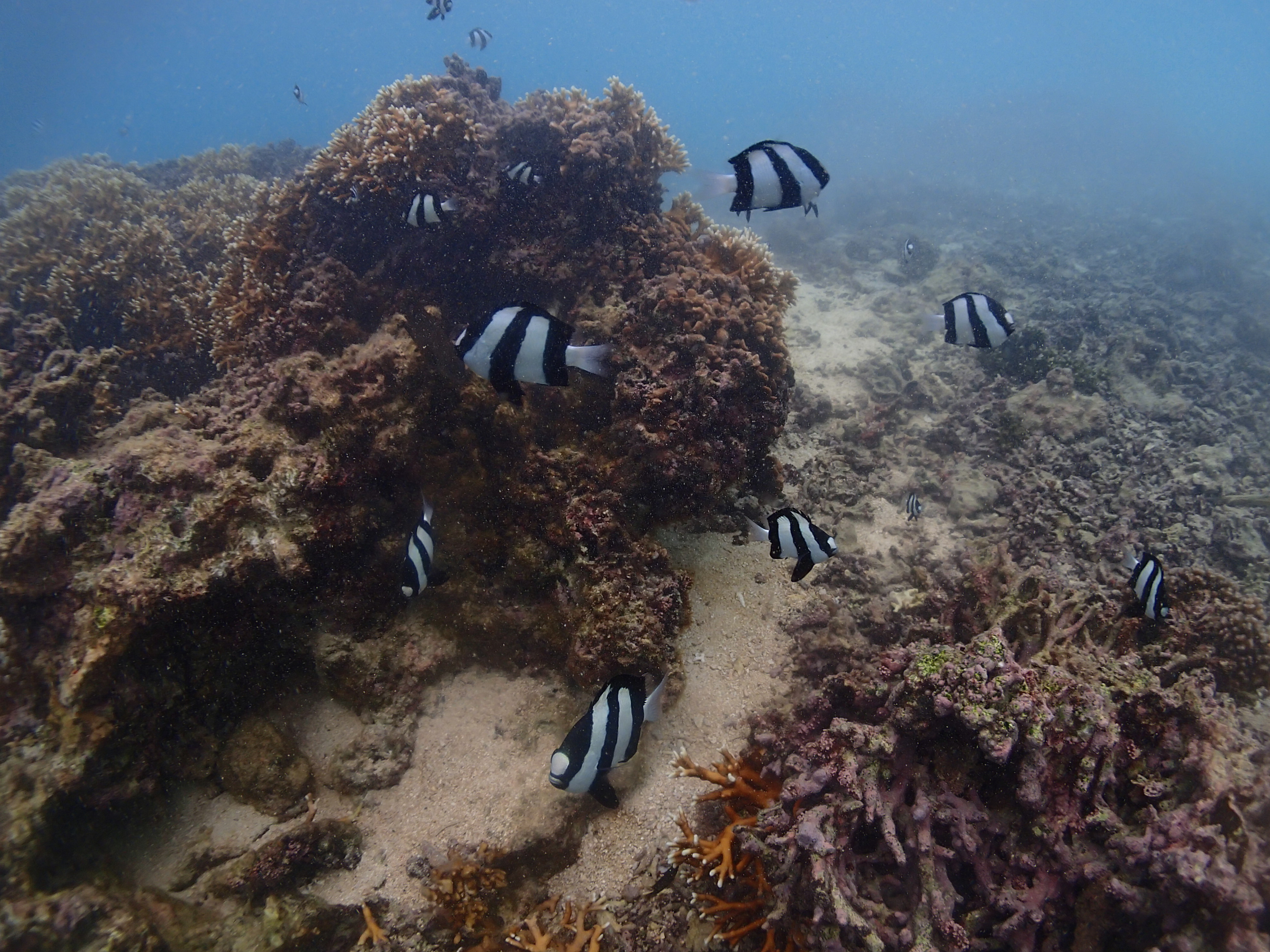 デバスズメダイの群れがサンゴの中でかくれんぼ![]()