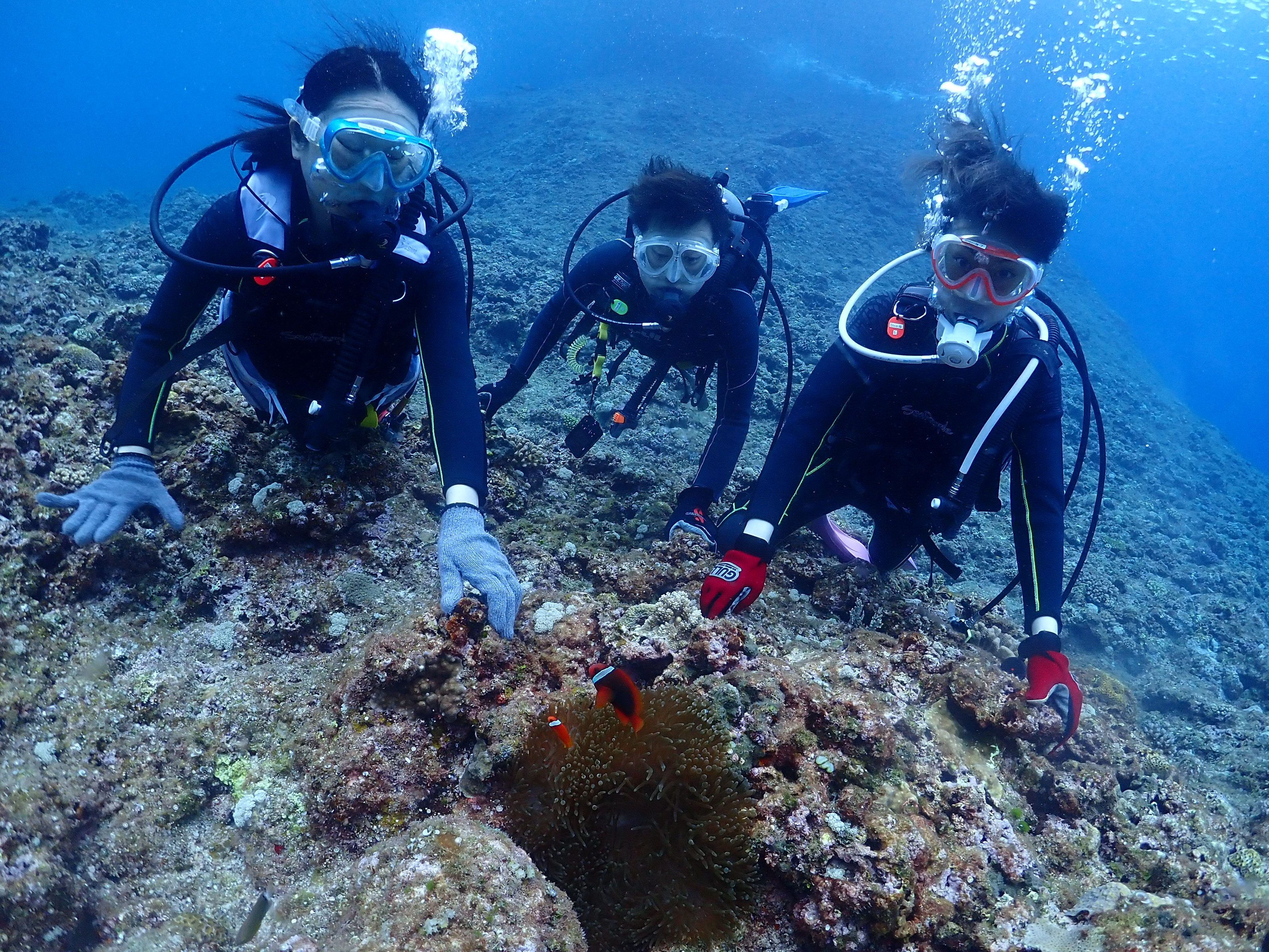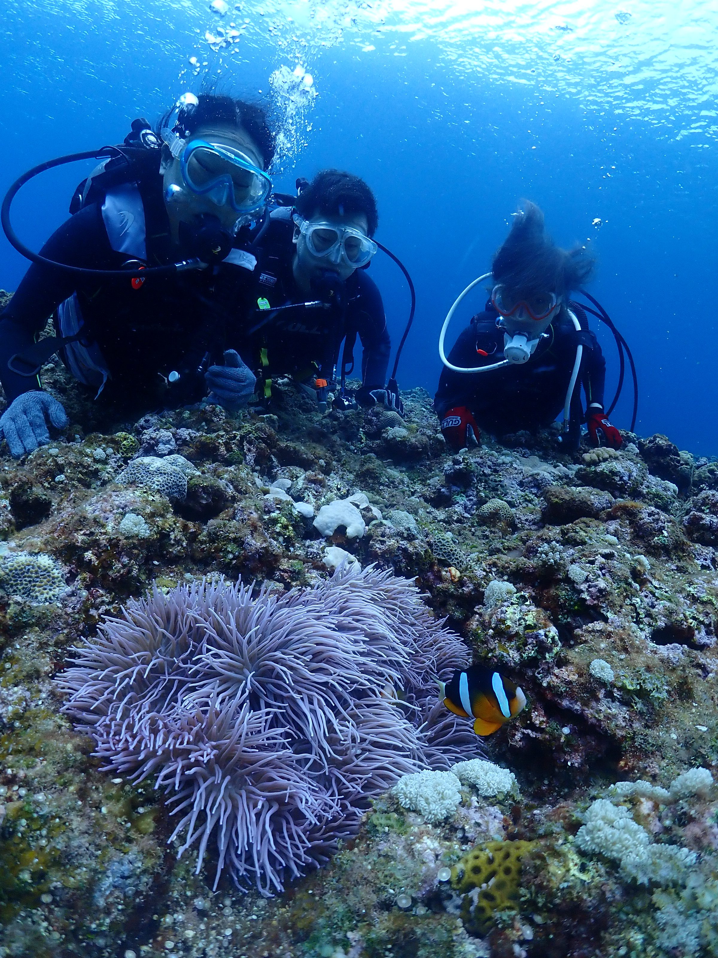 体験ダイビングでは目の前でクマノミ と ハマクマノミを見て一緒に![]()