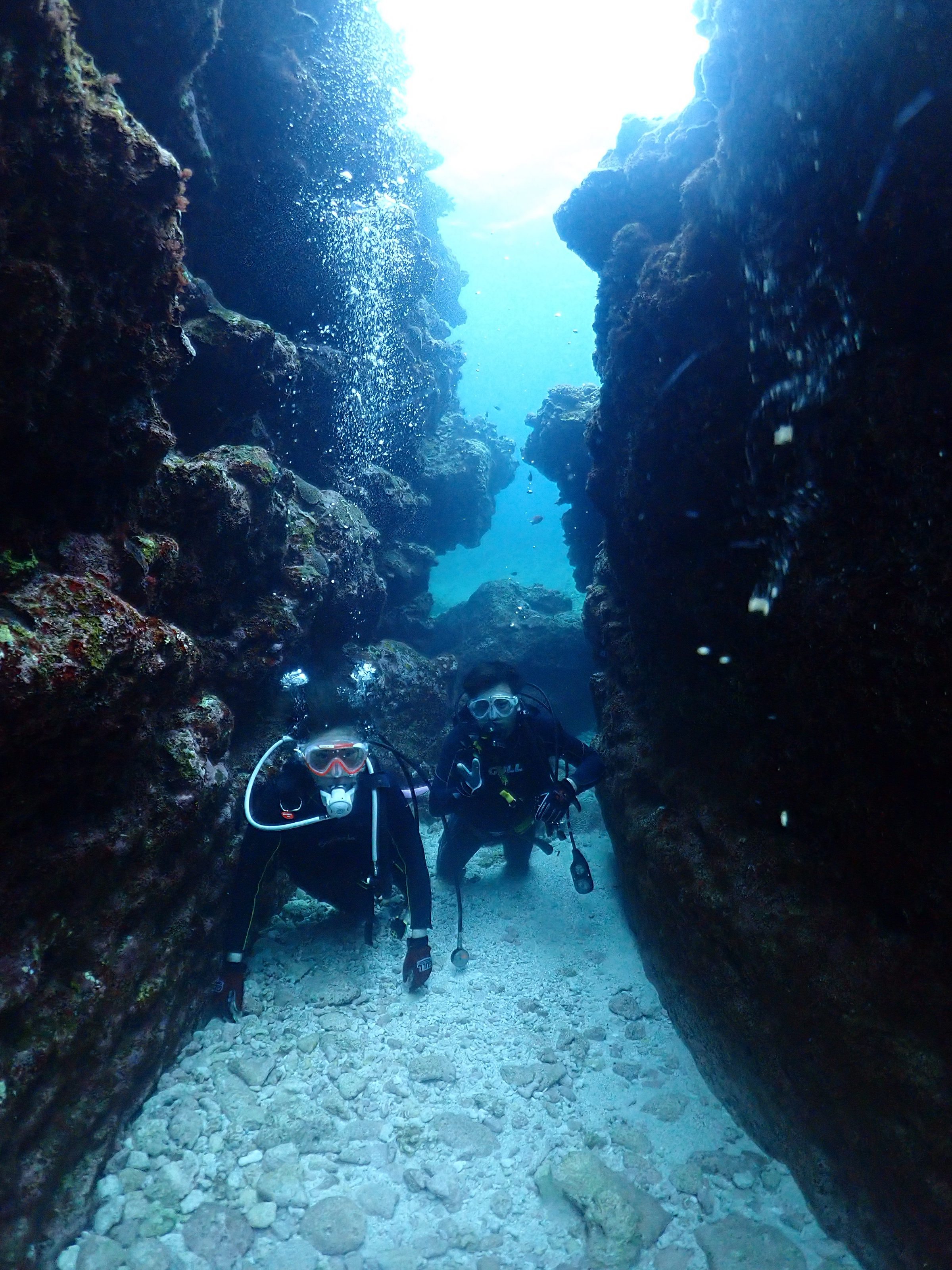2ダイブ目は沢山の亀裂の間を探検です。 時々こんな穴もくぐってきました![]()