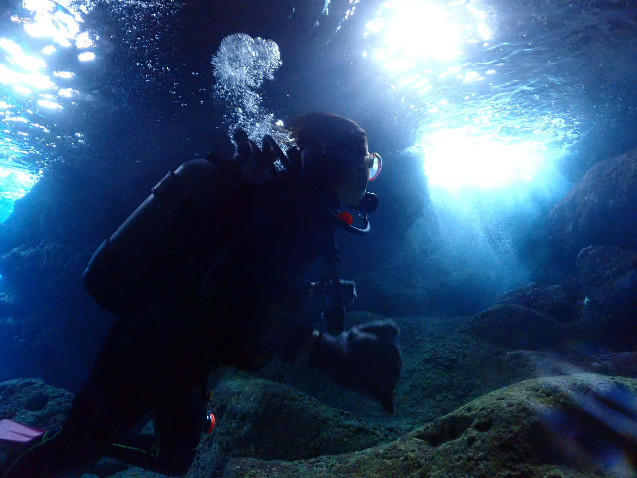 体験ダイビングでも入ることができる、宮古島の青の洞窟へ![]()