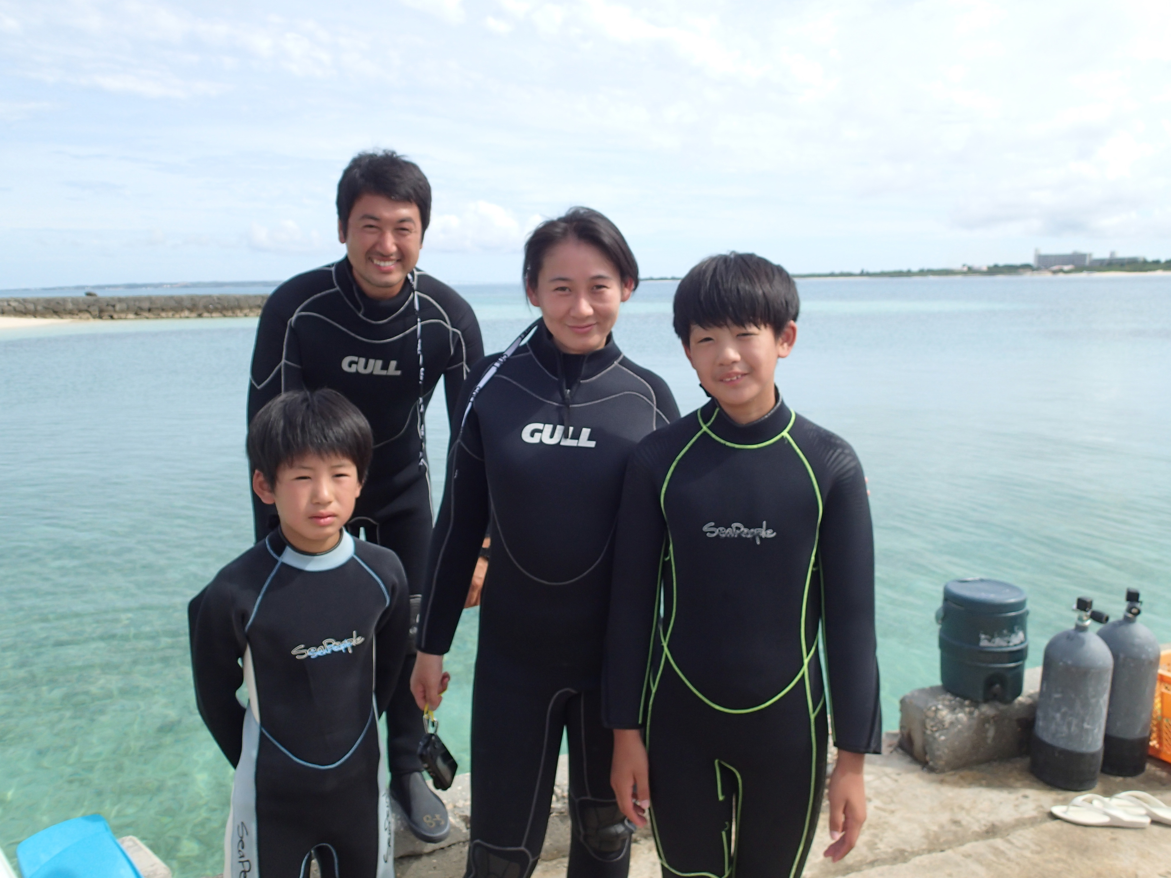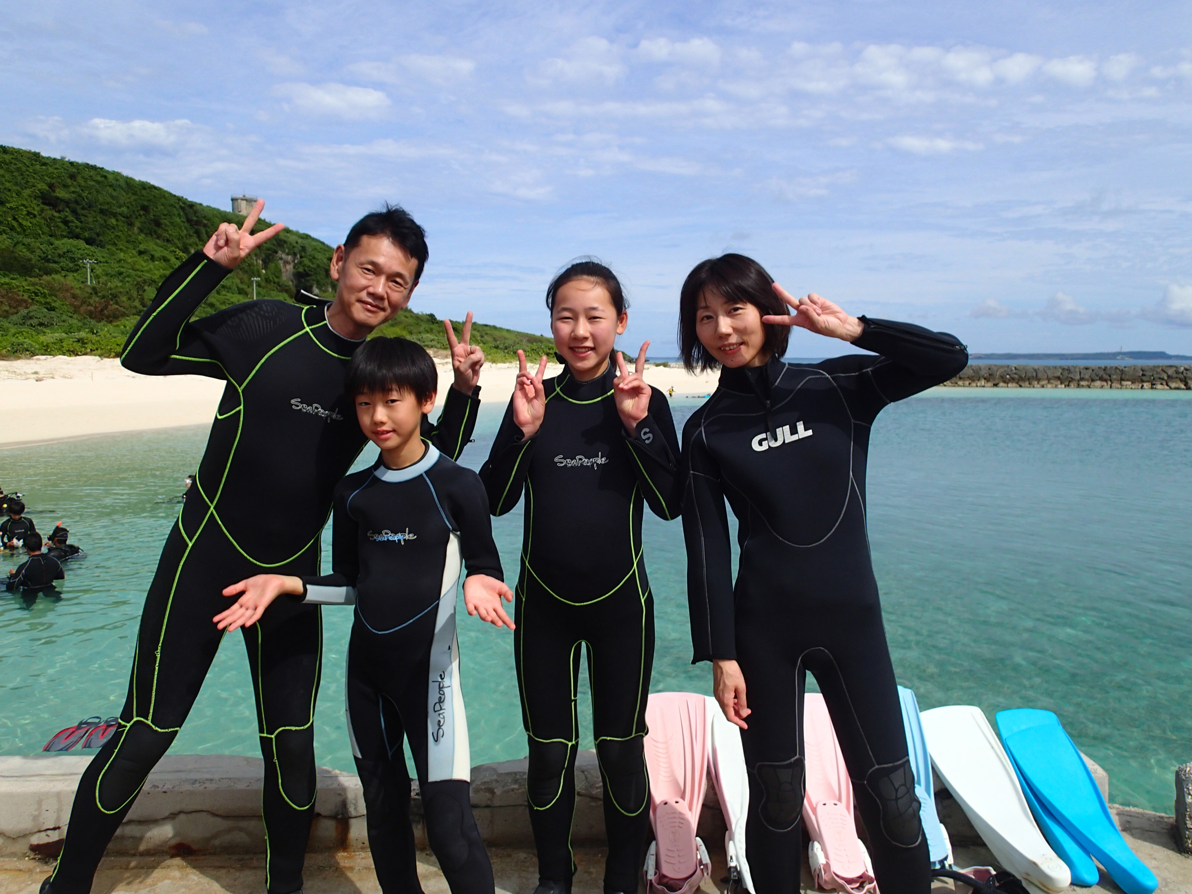まずは家族みんなのウエットスーツ姿を記念撮影![]()